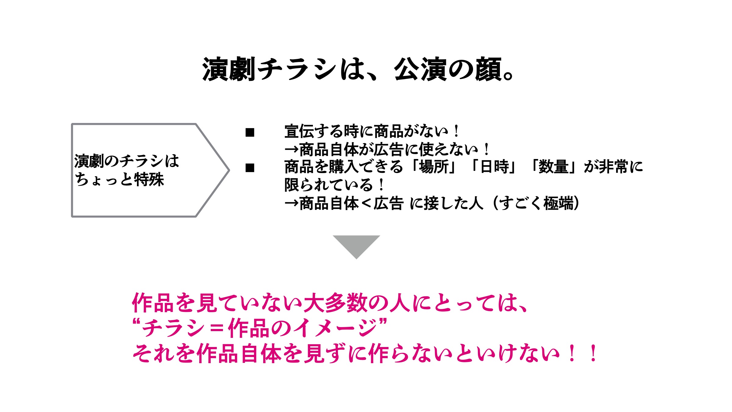 それがそのまま1万人に配られるかどうかはわからないですけど、でも単純に客席に座れる数よりもチラシで刷られる数の方が多いっていうことを考えると、商品自体に触れる人よりも、そのチラシに触れる人の方が圧倒的に数が多い。チラシを手にしたからって商品も手にできるとは限らないというところもある。
