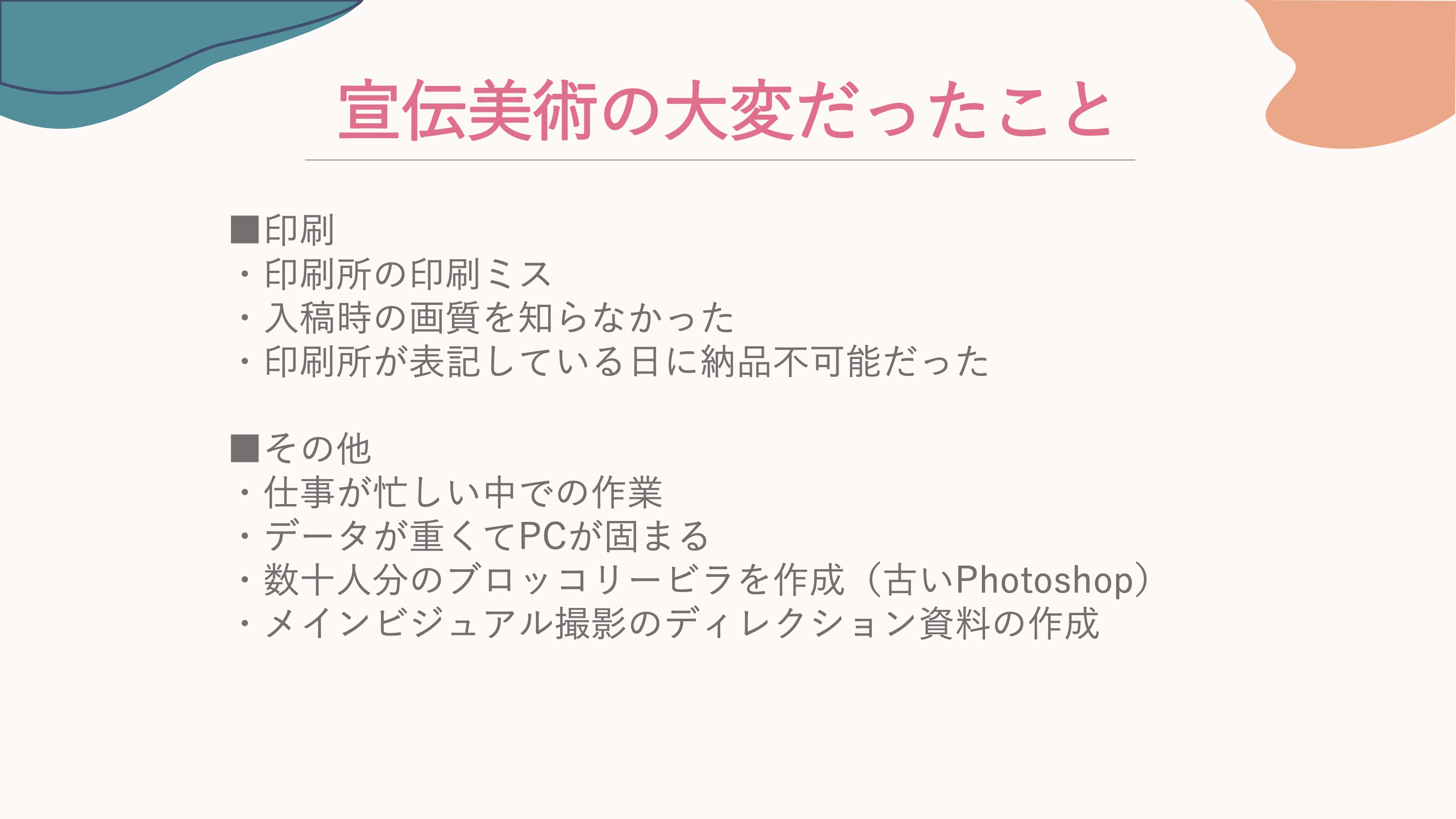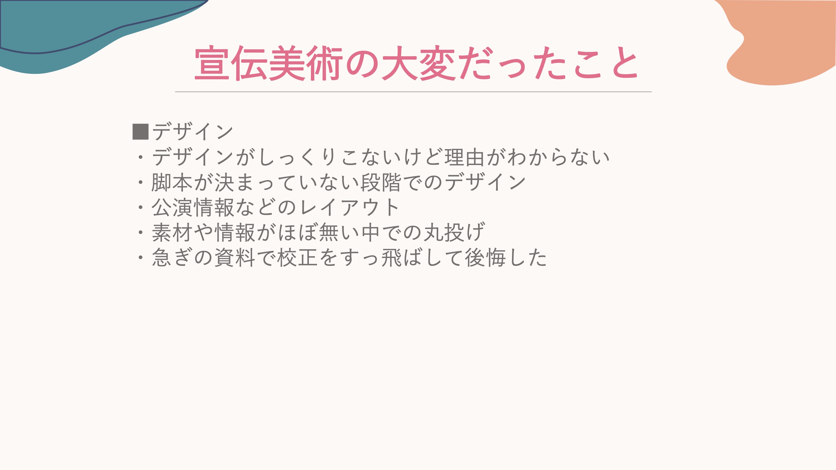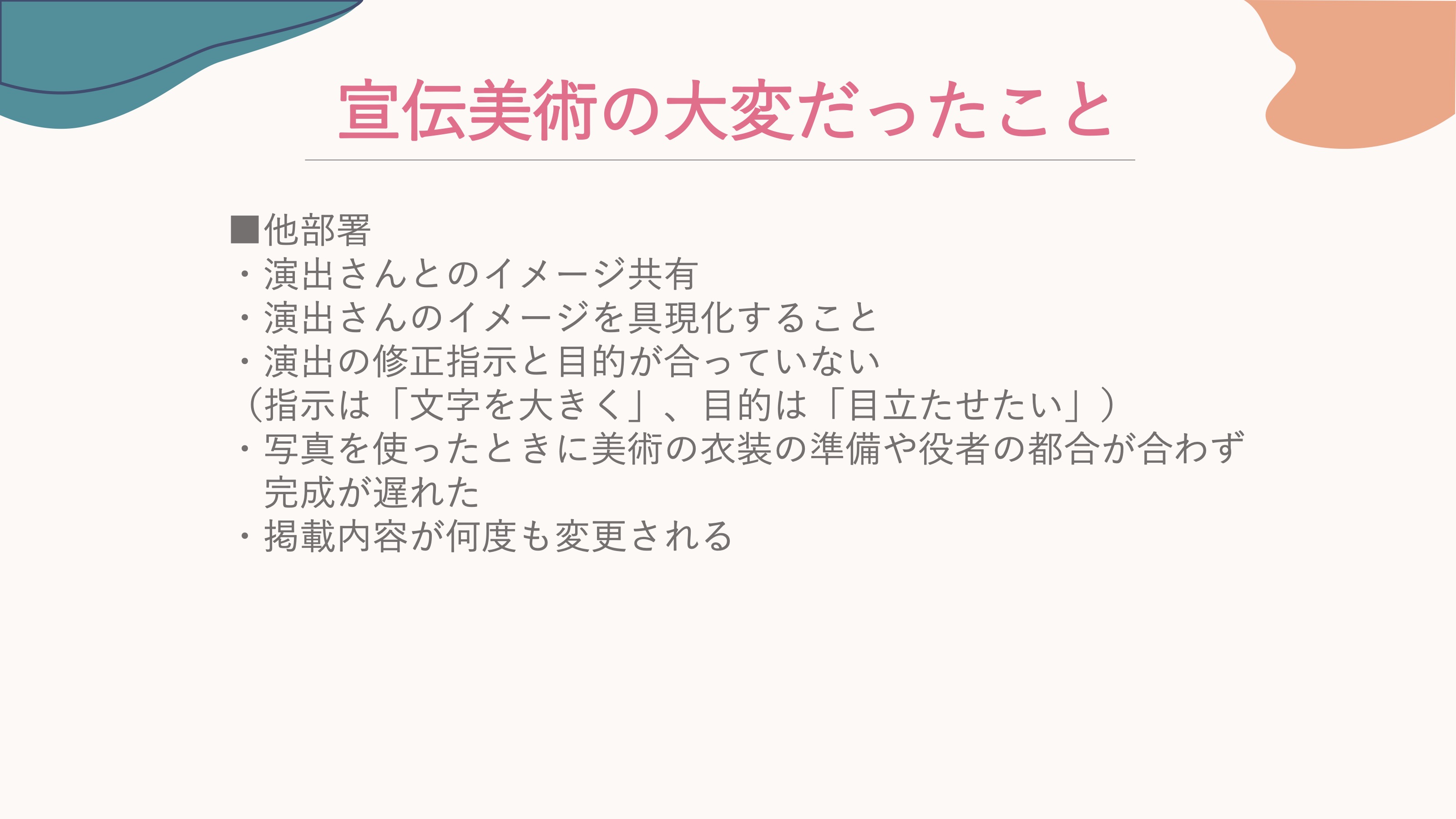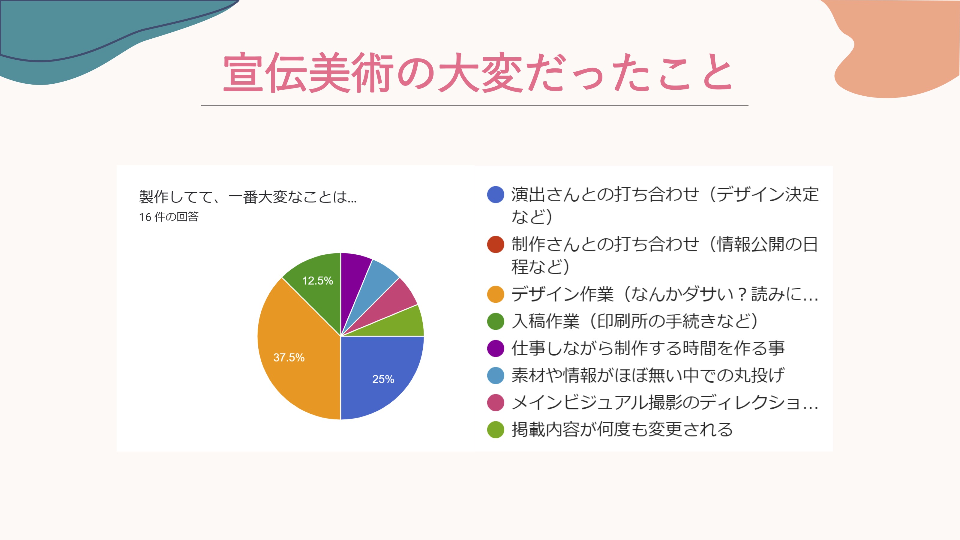 小藤: 演出さん側からも、結構細かく指示出しをしてしまって困らせちゃいましたっていう意見があって、ここを目立たせたいけど指示の出し方が分からないっていう方けっこういらっしゃると思うんですね。そういう時はなるべく、宣伝美術の側から提案できるといいですよね。 例えば「文字を大きくするとダサくなっちゃうんですけど、これってここを目立たせたいっていう事ですか?」って聞き返すことが必要だなと思いました。