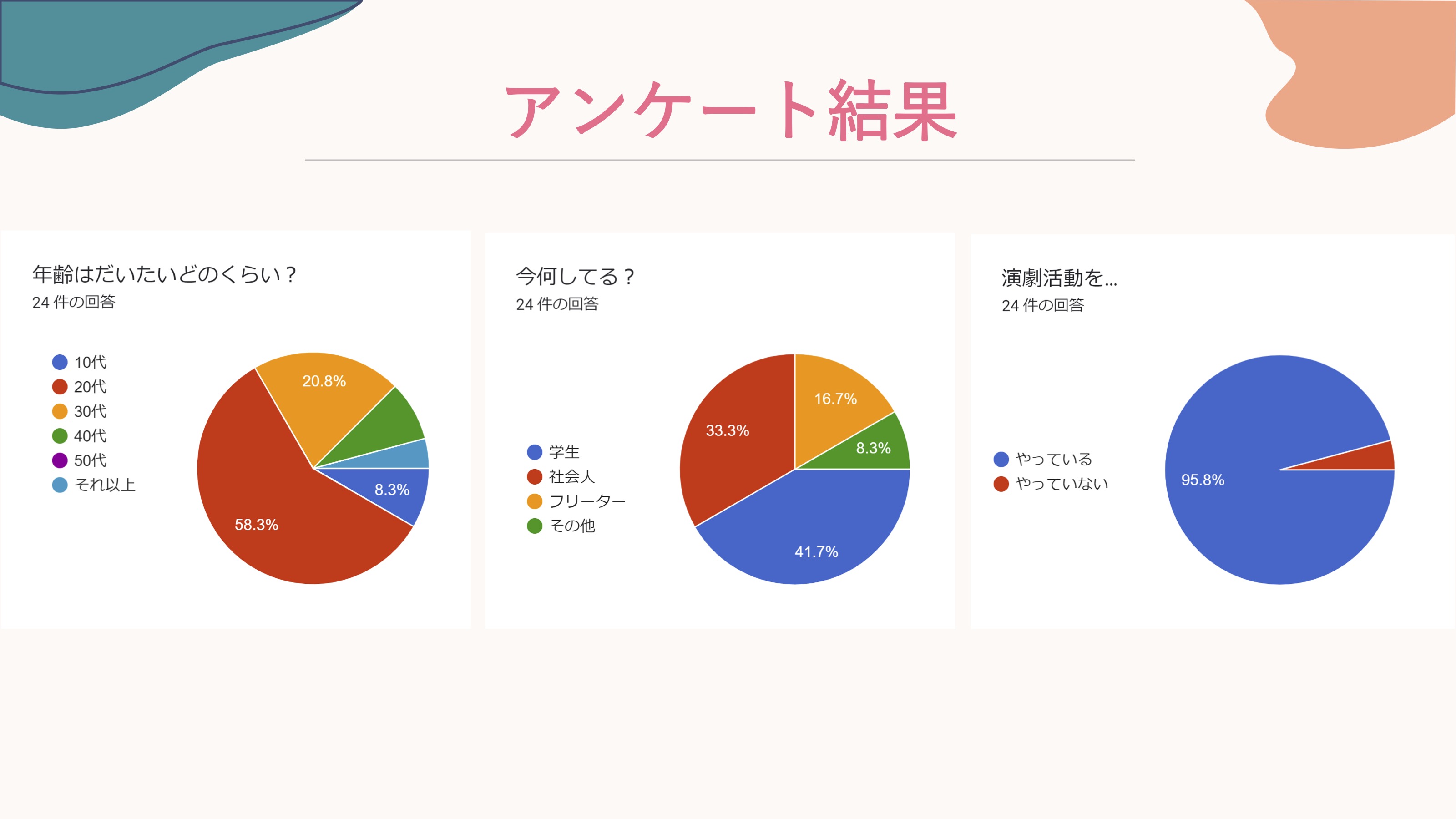 小藤: 今回は24名の方にアンケートへのご協力をいただきました。ありがとうございます。 年齢層では20代の方のご回答が一番多いですが、30代から50代以上の方も半数近くを占めており、かなり幅広い層の演劇関係者の方からご回答いただいている結果になってます。