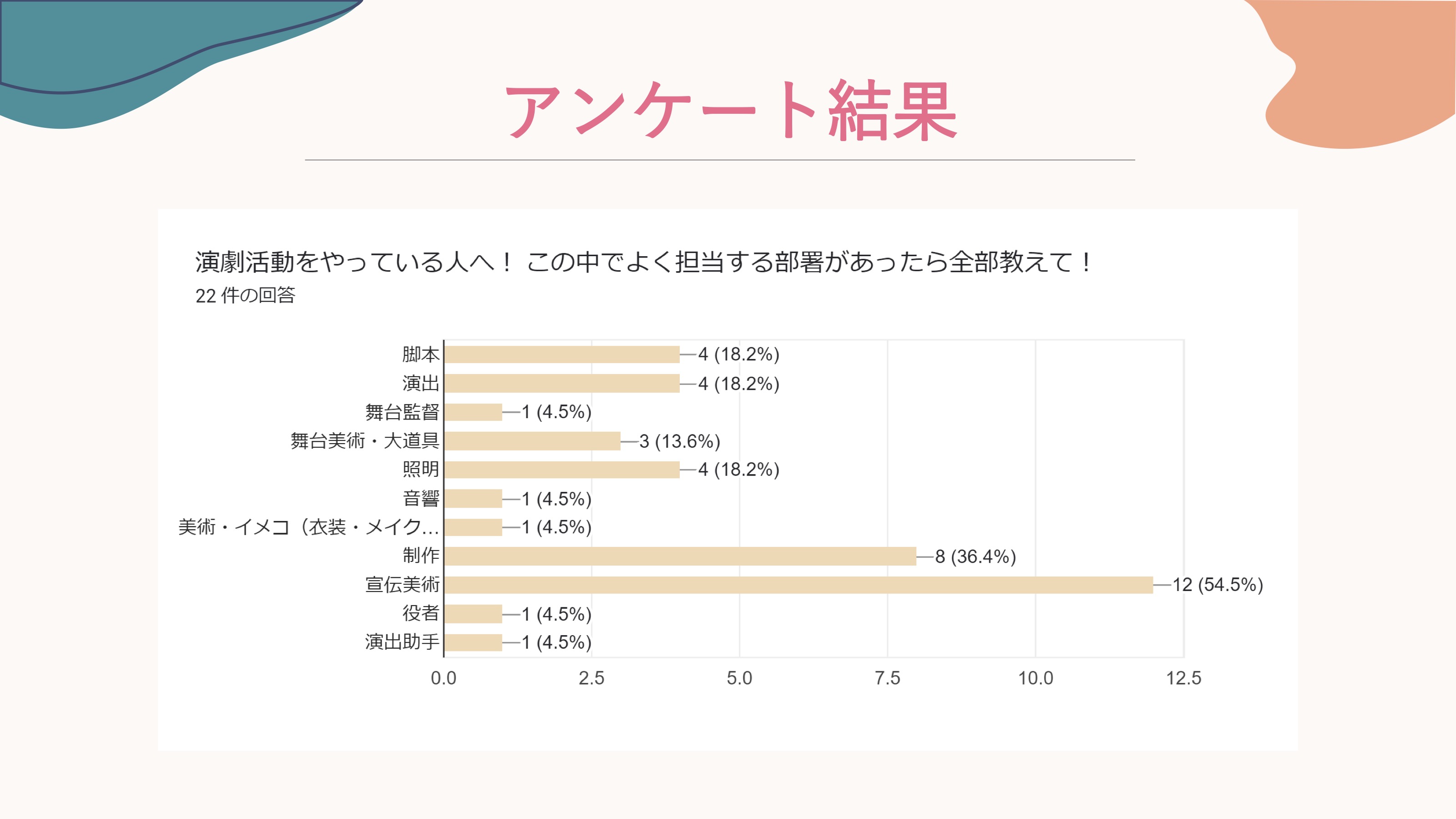 小藤: 嬉しいです。他には、宣伝美術と兼ねるとなるとやっぱり制作が多いんですけれども、それ以外にも脚本、演出、照明…いろんな方に答えていただいております。
