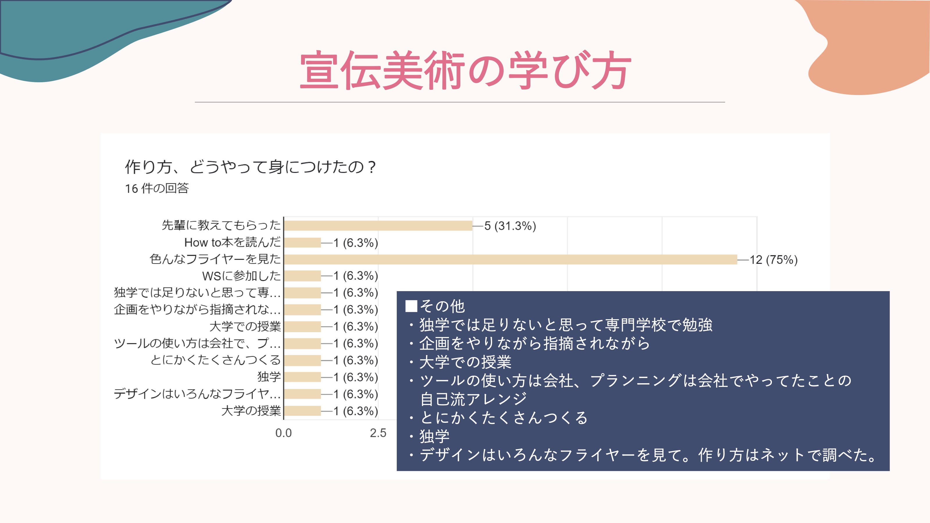 小藤: 実際に宣伝美術の技術をどうやって身につけたのかっていう話なんですけど。一番多かったのが「いろんなフライヤーを見て覚えた」。 私もそうなんですよ。 一枚でも自分でチラシを作ってみると、結構チラシの見え方って変わる気がして。ここちょっと文字を大きくしているなとか、目線の誘導…まずこれがパッと目に入って次にこっちが入って、みたいなことが客観的に意識できるようになると思います。 あとは学生の方だと思うんですけど、「先輩に教えてもらった」という方も多いですね。いろいろな学び方をしてる方がいます。お二人はなにか気になるものありますか?