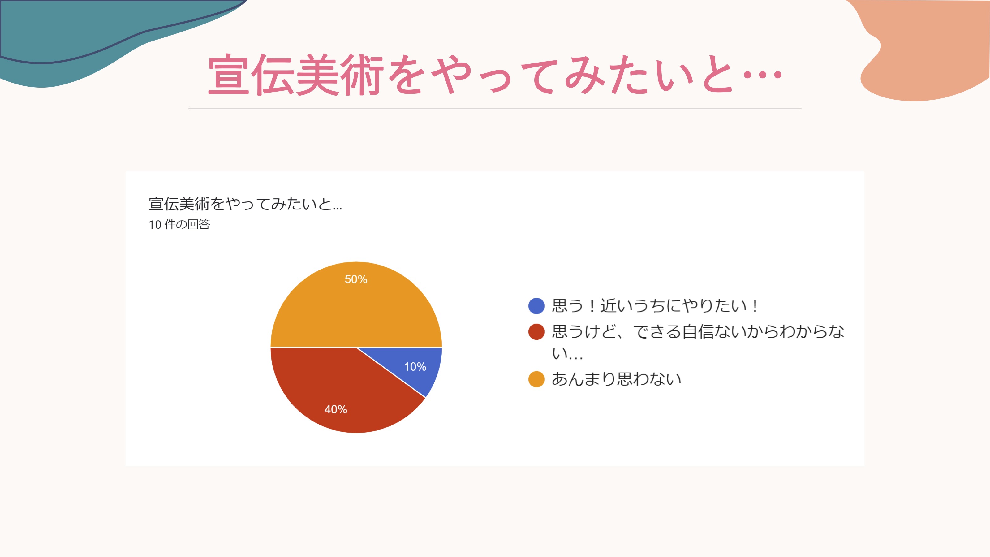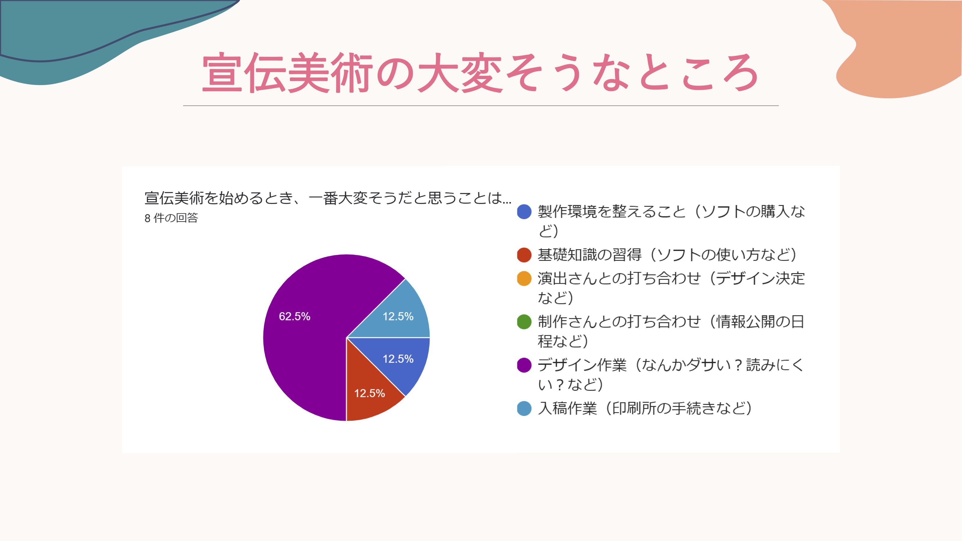 小藤: 宣伝美術をやってみたいと思うとあんまり思わないが半々くらい。個人的にはやってみたいと思っている方が意外と多いなと。 でもやっぱり、やってみたいと思うなかでもデザイン作業が難しいんじゃないかと考えている方が62.5%。他にはソフトの使い方とか、ちょっと専門的な手続きが大変そうという感じですね。