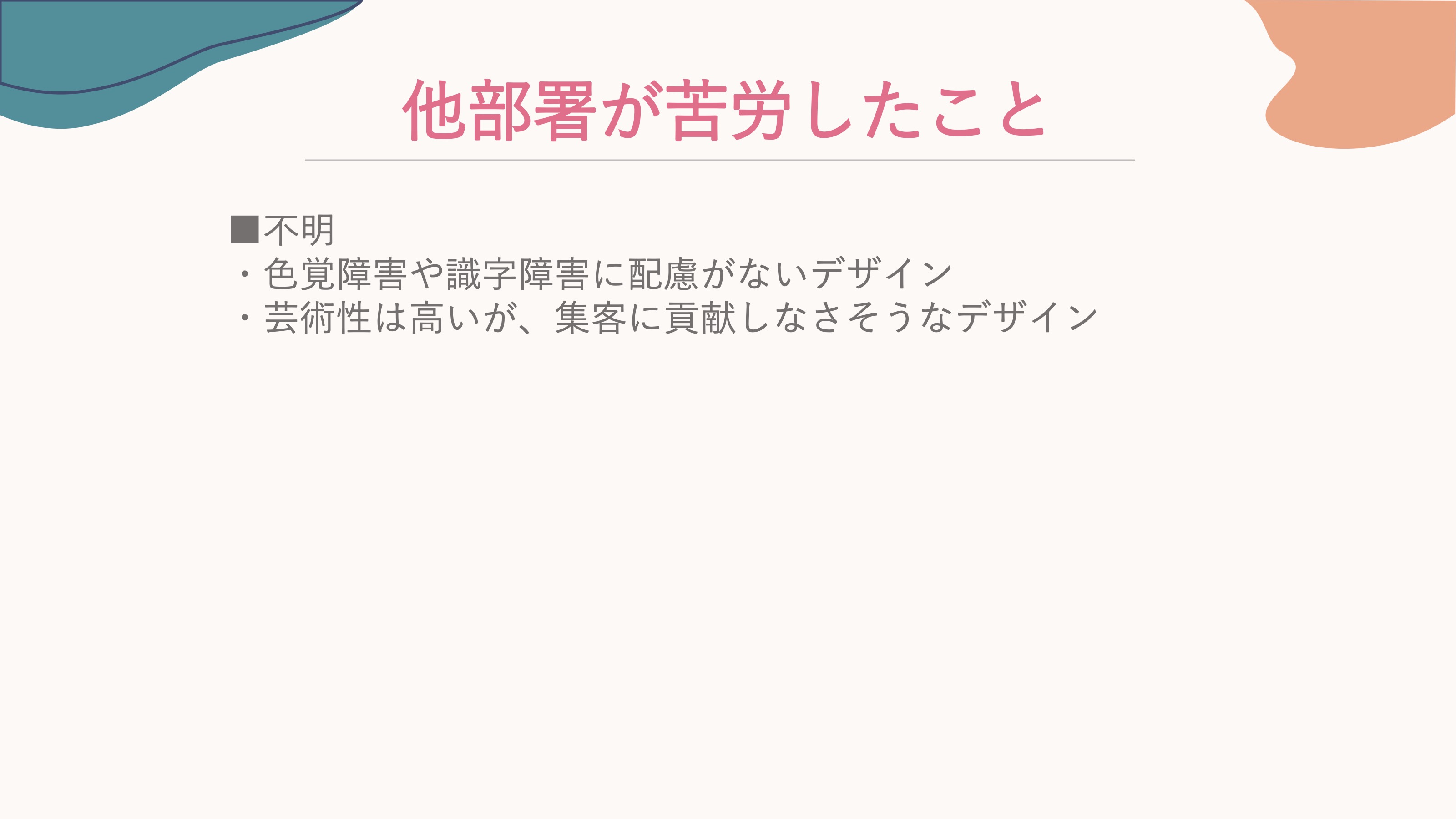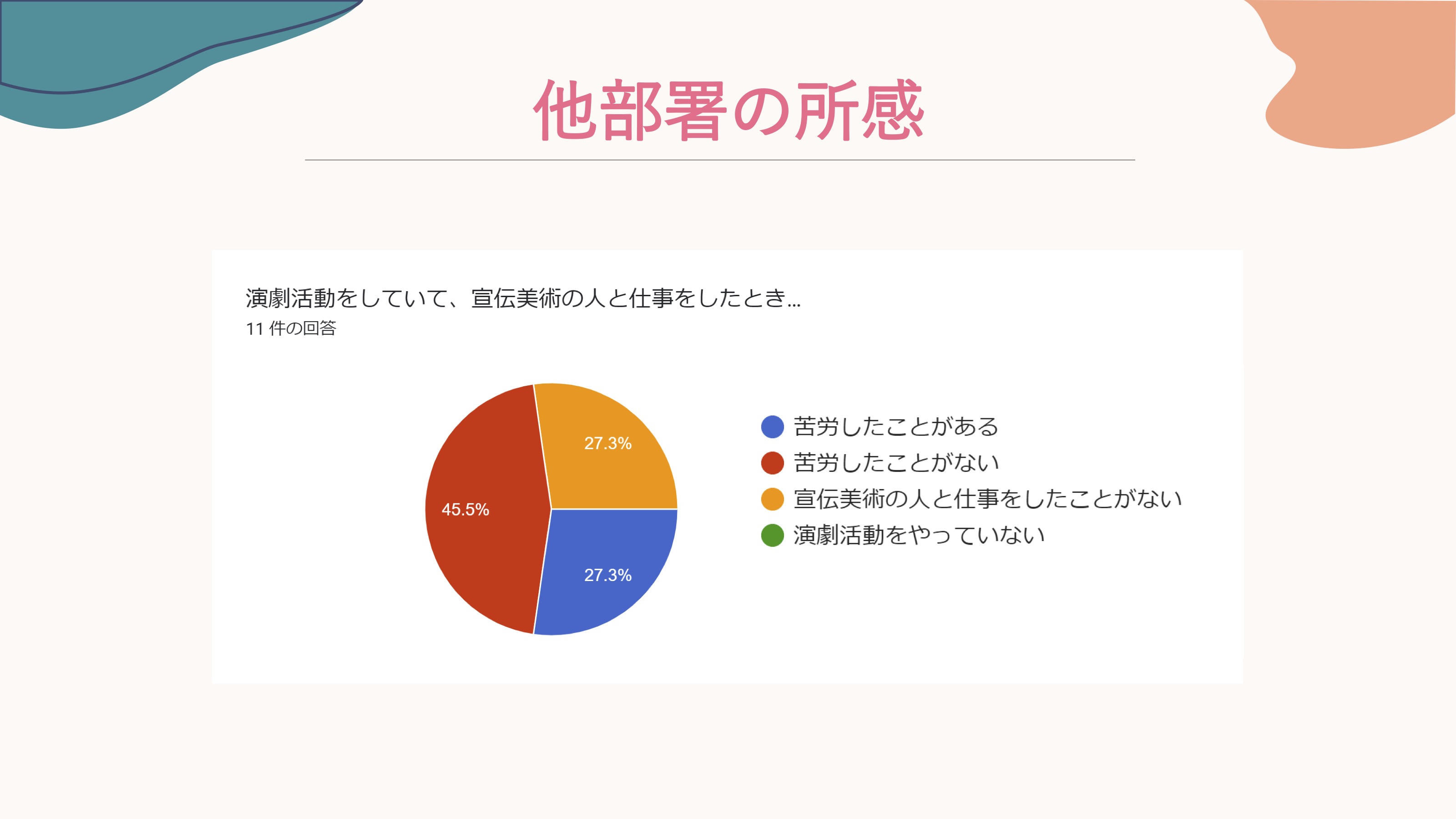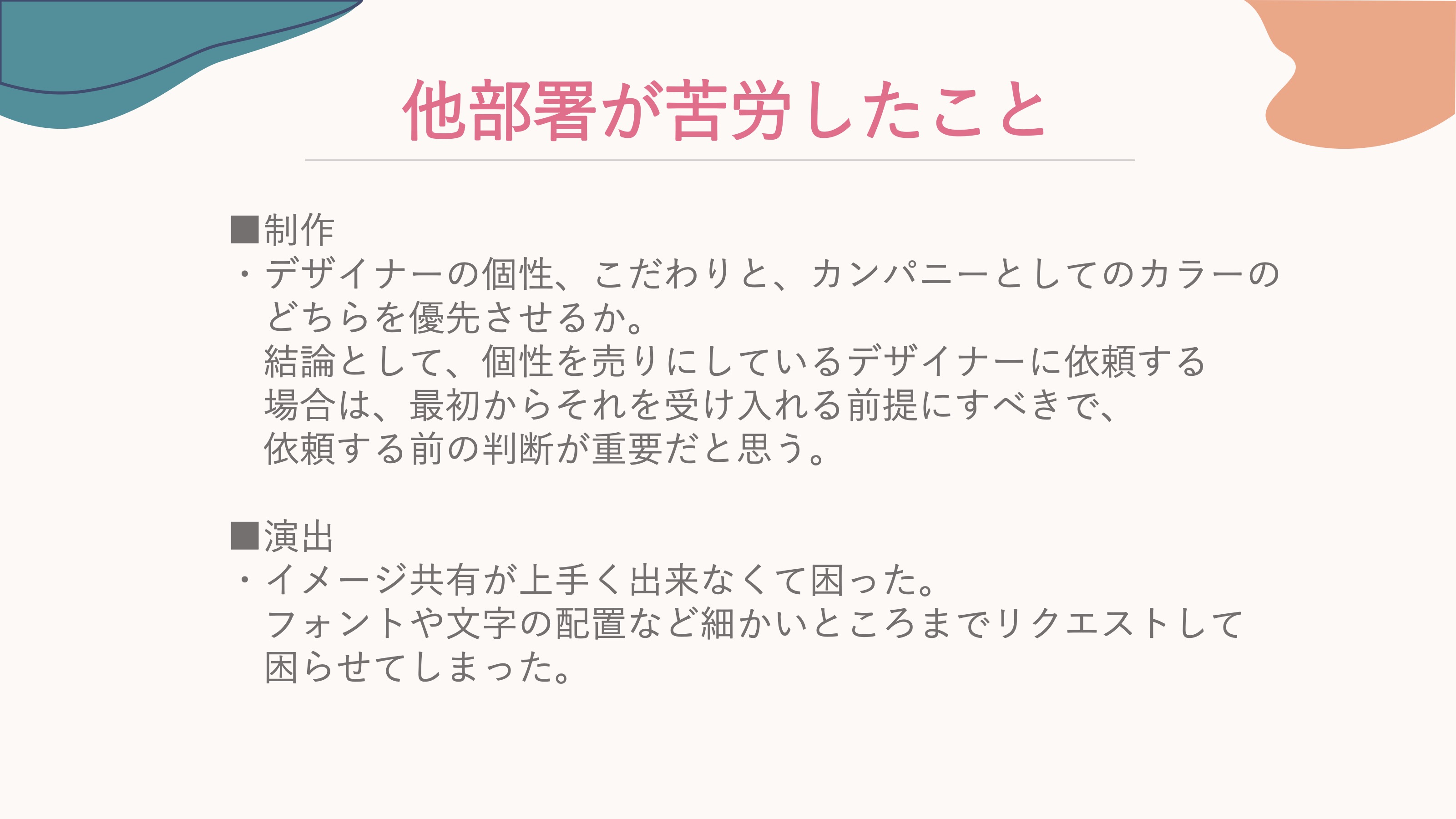 小藤: 続いて宣伝美術以外の部署の方からのご意見です。宣伝美術と仕事をしたときに苦労したことがない という方が半分くらい。