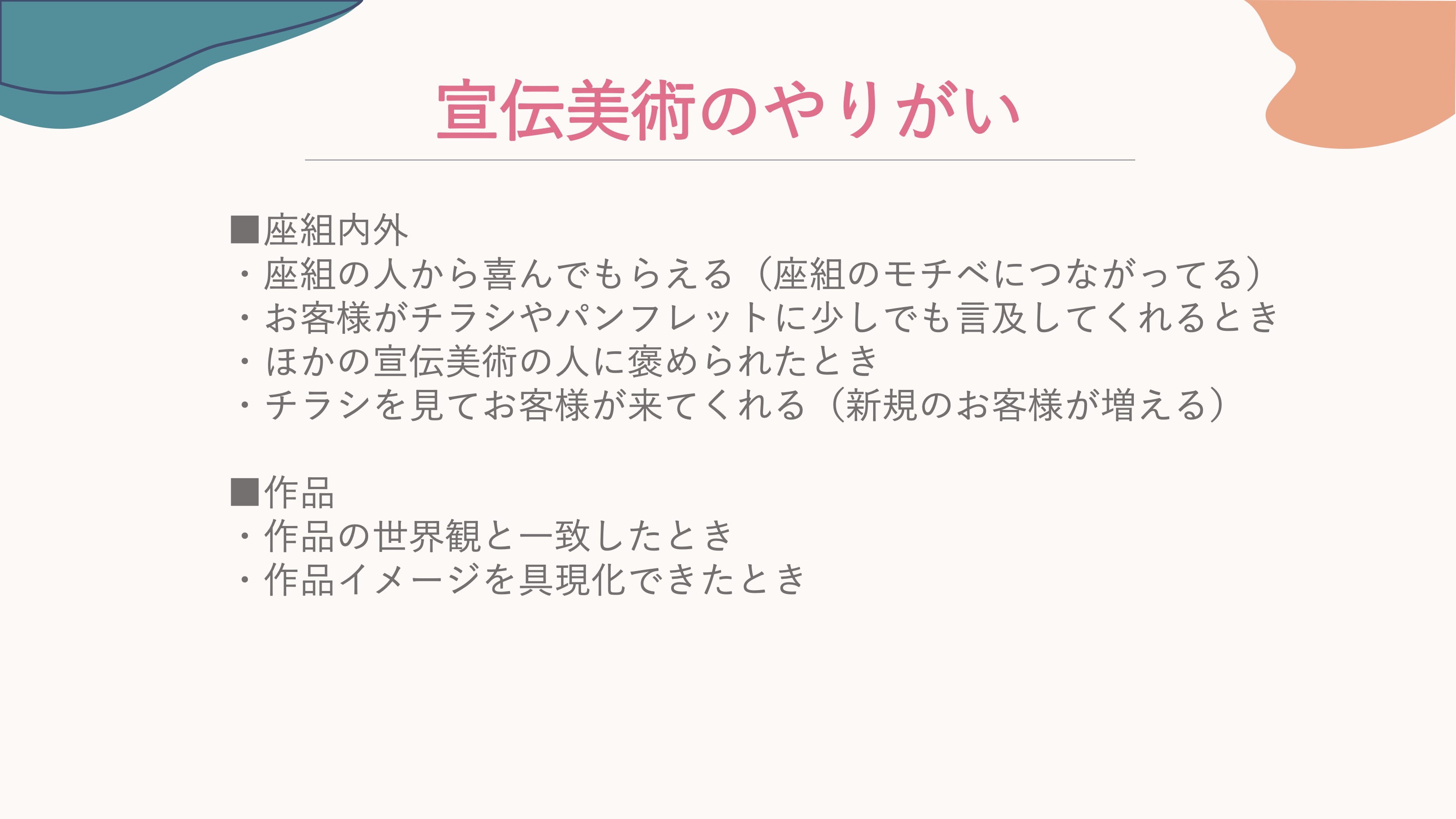 親方: 次はやりがい。この話は楽しいですね。座組みの人に喜んでもらえるとか、お客様に喜んでもらえるっていうのがやっぱり嬉しいというのと、ほかの宣伝美術の人に褒められる。これはめちゃくちゃ嬉しいですよね。