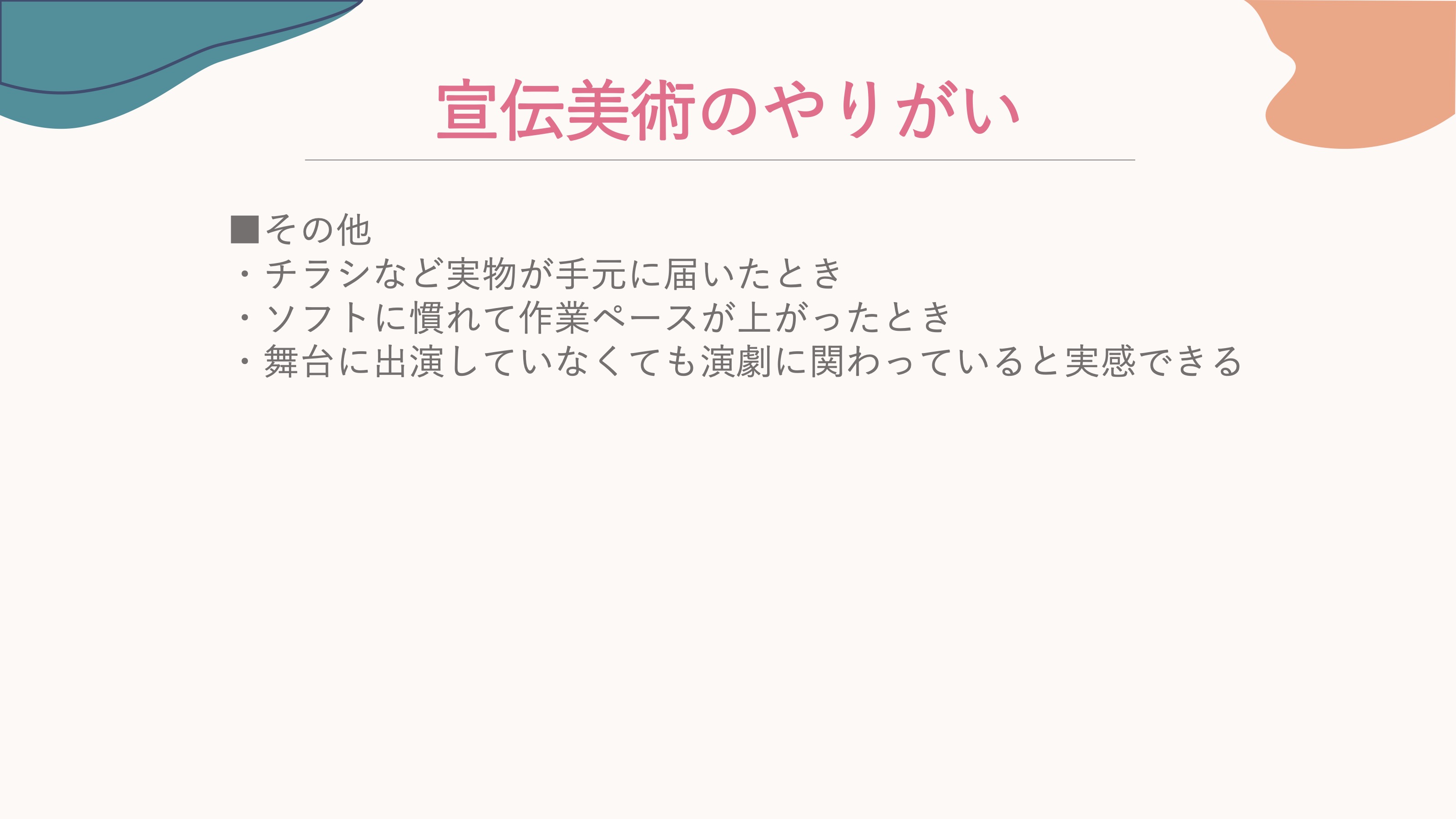 佐和: たまに舞台美術や他の部署の人がチラシのデザインから色やデザインを取り入れてくれていることがあって、そういうのは嬉しいですね。
